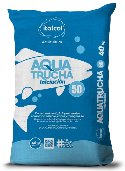 AQUATRUCHA INICIACIÓN 50 es un alimento completo para las etapas de Larvicultura y Alevinaje de Trucha Arco Iris. Suministre AQUATRUCHA INICIACIÓN 50 a larvas y alevinos de Trucha Arco Iris desde la primera alimentación hasta los 50 gramos de peso vivo con una frecuencia de 8 a 10 veces al día, en una proporción del 4% al 8% del peso de la biomasa de peces, según la temperatura del agua y el peso obtenido en los muestreos rutinarios.