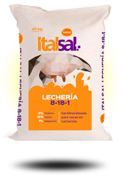 ITALSAL LECHERIA 8 -1 8-1 es una sal mineralizada para suplementar bovinos en pastoreo de praderas con contenidos de fósforo entre 0.25%y 0.30%, durante las etapas de crecimiento y ceba, y para vacas en lactancia en hatos con porción promedio entre 14 y 28 litros/vaca/día. El consumo esperado en animales en crecimiento es de 75 gr/día, y en v as en lactancia 120 gr/día.